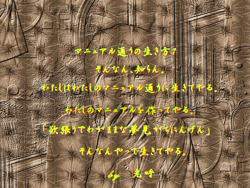× [PR]上記の広告は3ヶ月以上新規記事投稿のないブログに表示されています。新しい記事を書く事で広告が消えます。 今日で過去の中に自分を閉じ込めて… そこでもがいて… 出るはずもない答えを探すのゎもぅ辞めよう… ここで一度文章にして… 心の中から除去しよう。 かれに出会う前まで… 私ゎ自分の体をおもちゃのように思っていた。 気持ちもない相手に抱かれて眠り… 嫌われないように人をいじめ… 親の力を利用してみんなからお金を奪ったり… ともかくやりたいほうだいしてた… 今の彼に出会うまで… 男ゎ私の操り人形。 私ゎ男のおもちゃのように思っていた… そんなことをしてるせいで大好きな人の親から付き合いを反対され… 最終的にゎ… 会うことまで制限された… そして今の彼に出会うまで… 私ゎ誰も信じなかった… 大人も… 子どもも… みんな。 でも… その過去からやっと抜け出せる。 もぅ… やっと脱げ出せる。 はやくここから抜け出して… 幸せになりたい。 PR 私のこと 分かってくれる人 ずっと、待ってたの 私だけを 見てくれる人 ずっと、探してたの だけど やっぱり私なんてね 変な子だし 迷惑しかかけないし じっとしてた方がいいんだよね だって あなたの望んでるものと わたしが持ってるものは違ってて あなたが望んでるものは あの人が既に持っていて かないっこないものね わたしも 一緒にいたいのにな 一緒にいて 笑って 泣いて お歌歌って お空が好きなのは私なのに 自由におててを伸ばして 抱きしめて 独り占めにして お空を飛びたいのは私なのに やっぱり 青色もあの人のものになる そうやってわがままいうと あの人も そしてあの人が好きな人も 困っちゃうから わたし、そんなのみたくないし 二人とも わたし大好きだから だから ここだけが わたしの白い翼を広げられる場所にするよ ここはわたしのお空 わたしの世界 だれにも迷惑をかけないで おしゃべりをして ふわふわ飛んでいられるの わたしが生きていられるのは やっぱりあの人のおかげ そう思うから だからここで お空を飛んでいようと思うよ ![]() ――♪☆◆♪―――――――――――――♪◆☆♪―― 『 天使 』 by 光呼 ――♪☆◆♪―――――――――――――♪◆☆♪―― ねぇ、天使に会ったよ かわいい天使に会ったよ ふわふわしてて やわらかくって あたたかくって あいがこもってて ねぇ、わたしは 天使にはなれないけど 天使の羽になりたいな 羽になって 自由にどこまでも連れてくから 羽になって 自由にどこまでも飛ばせてあげるから ねぇ、羽になったら 天使とずっと一緒にいられるよね あいも一番そばで ぬくもりも一番ちかくで ずっとずっと 感じられるよね 天使の羽になったら たくさんのしあわせを降らせるね しあわせを降らせるお手伝いを わたしも一緒にするからね だからね、羽になりたいの 天使の羽に 天使のそばにいて あいをとどけたいの しあわせをはこびたいの 天使の羽になって、どこまでも 〇-----*****************************************-----〇 ★★★ 『 蒼穹へ一念放ち彼岸花 』 ♪♪♯ ☆☆☆ 『 迷惑かけて生きちゃおヽ 』 by 光呼 ♪♪♪ ★★★ 『 古い時も、蘇る時も、重なり合って・・・ 』 ★ 瘋癲老仁妄詩 6001 ♪♪♪ 〇-----*****************************************-----〇 ![]() ――♪☆◆♪―――――――――――――♪◆☆♪―― 『 夢見色 』 by 光呼 ――♪☆◆♪―――――――――――――♪◆☆♪―― ☆☆☆ 光呼の『 夢見色 』 より【 転載 】 ♭♭♭ 一人前じゃないから、できる。 一人前じゃないから、やりたいんだ。 わたしは、欲張りかな? わたしは、夢見がちかな? それじゃいつか、ダメになるかな? そんなんばっかりじゃ、ダメなんかな? でも、それでもやっぱり。 わたしはこんな風にしか生きれないんだろうな。 ダメになるのを怖がって生きるより。 ダメになっても、うんと夢を見れる自分がいい。 そのほうが、笑っていられる。 もっと、楽しんでいける。 わたしは、夢をみたいんだ。 マニュアル通りの生き方? そんなん、知らん。 わたしはわたしのマニュアル通りに生きてやる。 わたしのマニュアルを作ってやる。 「欲張りでわがままな夢見がちにんげん」 そんなんやって生きてやる。 そんな生き方が見たいから、わたしがそんな風に生きるんだ。 わたしが、そうやって生きてみるんだ。 楽しそうだから、やってみる。 自分で見つけて、自分でやる。 それって、すっごい楽しい。 軸がぶれない生き方って、カッコイイ。 どんなにカッコ悪く見えたとしても、カッコよく見えちゃう。 そんな風に生きているだけで素敵。 そうやって生きてる人に、魅力を感じる。 まずは、その軸探し。 それが見つかれば、あとはなんでもいいや。 なにをやっても、全部それでいいや。 いつかその軸が変わってもいい。 今だけの軸でも。 これからずっと続く軸でも。 どっちでもいい。 その時に自分に大事な軸を、自分に合わせてぶれないようにする。 そんなんでいい。 自由に生き