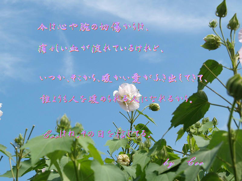 × [PR]上記の広告は3ヶ月以上新規記事投稿のないブログに表示されています。新しい記事を書く事で広告が消えます。 ――☆◆♪―――――――――――――――♪◆☆―― 人間じゃんか by ふぅ ――☆◆♪―――――――――――――――♪◆☆―― この世界の基準はなんだ 人間の基準はなんだ 綺麗ごとは好きでもないし嫌いでもない 上辺は好きでもないし嫌いでもない それで救われることだってあるから なんなんだ 人に好かれるよりは嫌われたほうがいい 面倒臭い わたしだって苦しいんだよ 人目気にしてるのは自分じゃんか 傷跡隠してるのは自分じゃんか 傷跡をつけたのは人間じゃんか 傷跡を甘えだと決め付けるのも人間じゃんか 分かりあえないのも人間じゃんか 付き合ったって 結婚したって 血がつながってたって 分かりあえることなんて出来ないのが人間じゃんか 人間を生むのも人間じゃんか 履歴書みたいに病名並べたがるのも人間じゃんか 自分の気持ちをだれかに分かって欲しいのも人間じゃんか 傷つけあうのも人間じゃんか 順番決め付けたがるのも人間じゃんか 結局後悔するのが人間じゃんか わたしってなんだろう ――☆★☆―――――――――――――――☆★☆―― 縛られない心が人をつないでくれるんだね ――☆★☆―――――――――――――――☆★☆―― いつもいつも気がつくのが遅いんだ。 気がつきさえしないこともあるんだよ。 自分のことしか見ていないんだね・・・ けれど、支え合うのも人間だよ。 つながり合うから人間なんだよ。 ふぅ、こころが痛いね。 ふぅ、ひとりぽっちがさみしいね。 けれど、ふぅ、 独りの道は自由でいいね。 そして、ふぅ、 独りの道は豊かでいいね。 縛られない心が人をつないでくれるんだね。 こっちの人間で、 今、Cooとつながっている者は、ふぅしかいないんだろうね・・・ Cooとつながれる心がうれしいよ。 夢を見た日々があったね。 でも、まだ、夢を見続けようね。 夢を描きつづけよう。 夢を歌いつづけよう。 夢を語りつづけよう。 まだ、仁の中にも、ふぅとつながり合える心あるよ。 まだ、仁の中にも、Cooとつながり合える心あるよ。 けれど、無力だね・・・ けれど、仁は、つながり合っていると信じていくよ。 けれど、仁は、あいしているよ、ふぅ。 ☆☆☆ 『 なんだ 』 by ふぅ より【 転載 】 ♭♭♭ ![]() PR ――☆◆♪―――――――――――――――♪◆☆―― 人を暖められる人になれるから by Coo ――☆◆♪―――――――――――――――♪◆☆―― 今は心や腕の切傷からは、 痛々しい血が流れているけれど、 いつか、そこから、暖かい愛がふき出してきて、 誰よりも人を暖められる人になれるから。 Cooはね。その日を信じてる。 ☆☆☆ 『 子ども達の戦い 』 by くぅ ♭♭♭ ![]() 〇-----*****************************************-----〇 ★★★ 『くじらの背中に乗って』 by Coo ♪♪♪ ★★★ 『 今でゎ、すべてが、私の宝物 』 by 星呼 ♪♪♪ ★★★ 『 空蝉に心の空を移しけり 』瘋癲老仁妄詩 1402 ♪♪♪ 〇-----*****************************************-----〇 ――☆★☆―――――――――――――――☆★☆―― 自らを光として歩くふぅがいる ――☆★☆―――――――――――――――☆★☆―― 仁は後退りするばかりだよ。 もう前へ行く夢もパワーもないんだもの・・・ 失われた夢をひとり遊びで遊ぶばかり・・・ 夢よ、もう一度、・・・ 起こるはずのない復活の夢はもう見ない。 けれど、ふぅが、歩いていく。 独りで、歩く茨道。 信じて歩く希望の道。 その道の先には、やっぱり、maikoがいるんだ。 その道の先には、やっぱり、大切なものがあるんだ。 ふぅが歩いていく道の後方を、 臆病者の仁は、そっと、後ろから歩いていく。 ふぅが躓いて転んだら、 起こしてやることくらいできるだろう。 傷口から流れる血を拭ってやることくらいできるだろう。 はじめっから仁には、 maikoを見る力などなかったけれど、 ふぅにはmaikoが救いだった。 ふぅにはmaikoが希望だった。 maikoを信じたふぅがいた。 今では、もう、自分を信じたふぅがいる。 今では、もう、自分を創りだすふぅがいる。 自分を信じるように、 maikoを信じるふぅがいる。 自らを光として歩くふぅがいる。 ☆☆☆ 『 大切なもの 』 by Coo ♭♭♭ ――☆◆♪―――――――――――――――♪◆☆―― 些細ないじめから内気になって… by 星呼 ――☆◆♪―――――――――――――――♪◆☆―― 過去を話します… 受け入れてもらえるか… そんなこと。って思われないか…怖い…でも私が私として過ごすためにゎ…みんなに知ってもらわなきゃ… 私ゎ保育園の頃から母をしりませんでした…入退院を繰り返していたので…毎日ばぁちゃんのバイクに乗って保育園に通っていました…保育園にゎ発達遅れの子が一人いました…その子をいじめていました…でも酷いいじめのときゎその子をかばっていました…いつの間にかその子の母親がわりになり…小学校に上がると…