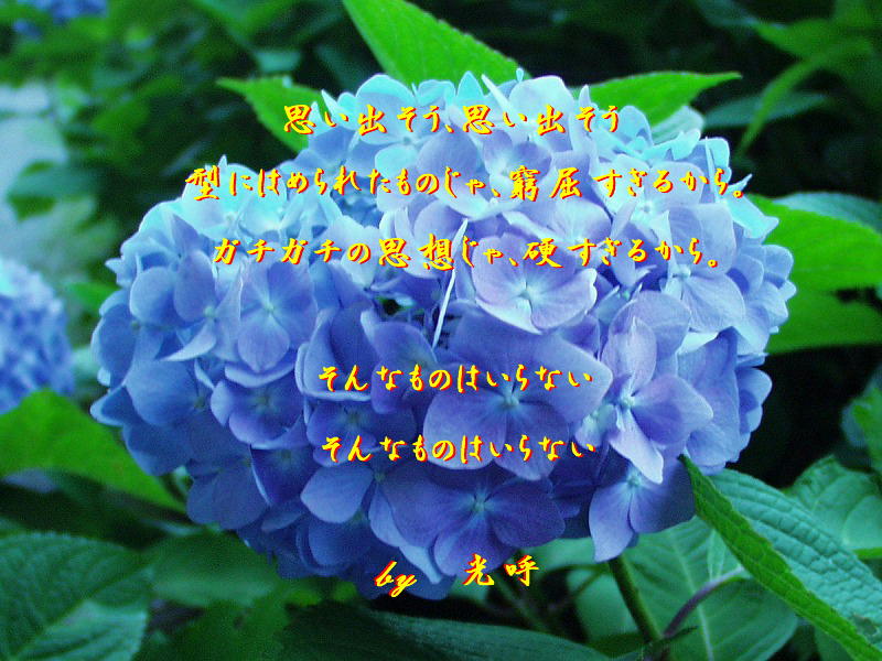 わたしという現実を好きになっていけそうになりました by のぅ ――☆★☆―――――――――――――――☆★☆―― そうなんですね、何かを得たと思っていても、 いつも掌を滑り落ちて、 拾い上げてみると、やっぱり、別のものだったりすることが多いんですよね。 どんなに受け入れても、受け入れても、 受け入れたものは、もう、すんだもので、 ほしいものは、もう、先を、歩いているんです。 追いつけないわたしを、 置いてけぼりにしていくんです。 そうなんですか・・・ 追いつけないのは、心の磨き方が足りないのでしょうか・・・ 先を歩くあなたがわたしを気にとめていないからなのでしょうか・・・ 得たいものは、何だったのかさえ、今では、わからなくなっているわたしがいます。 けれど、ここで止まっていてはいけないんですよね。 もう一度、わたしにできることを、 一つひとつ、 こつこつと、 はじめていくしかないんですよね。 わたしは行きたいところがある。 わたしはやりたいことがある。 光呼さんのあいパワーをもらって、そんなはじまりを今感じるようになっています。 Messiahさんのすごいパワーももらえました。 時間を食べて、時間を食べて、 もっと、もっと、受け入れて、 わたしという現実を好きになっていけそうになりました。 ありがとう、あいパワー。 ★★★ 『 わたしという現実を好きになっていけそうになりました 』 by のぅ より【 転載 】 ♪♪♪ http://mixi.jp/view_bbs.pl?id=16753570&comment_count=8&comm_id=1300328 〇-----*****************************************-----〇 ★★★ 『 「学校できちんと教えて」=集団自決に遺族ら-「慰霊の日」の平和祈念公園・沖縄 』 ♪♪♪ ★★★ 『 妬けるほど清楚にありぬ七変化 』 ♪♪♪ ★★★ 『 「豪快な号外」配ってみようよ ★ 仁の TEAM GOGO! 2007 』 ♪♪♪ 〇-----*****************************************-----〇 PR ――☆★☆―――――――――――――――☆★☆―― 『 ミラクル、起こしてみせますとも☆ 』 by 光呼 ――☆★☆―――――――――――――――☆★☆―― まだまだこれからやん。 まだまだいまからやん。 わたし、ここからいきたいばしょがある。 まだまだ、こえなきゃならんもんがある。 でも、思ったより大丈夫。 なんか楽しみになってきたよ。 さあ、どうやって楽しくのりこえていけるかな? どんだけ笑ってられるかな? ミラクル、起こしてみせますとも☆ ☆☆☆ 光呼の 『 ねえねえ 』 より。 ♭♭♭ ★★★ 今日の『 語り愛・つながり愛 』 ↓↓ 『 こつこつやってもなぁと思う前にこつこつやれ 』 by Messiah ♪♪♪ 〇-----*****************************************-----〇 ☆☆☆ 豪快な号外『 「楽しみ笑いながら、30秒で世界を変えちゃう新聞」をダウンロード(無料) 』 ♭♭♭ ★★★ 『 ただ、ただ、だきしめたい 』 by 光呼 ♪♪♪ ★★★ 『 ねぇ、声かけ、してみようよ。すこしでも、多くの人に。 』 by 未来子 ♪♪♪ 〇-----*****************************************-----〇 ――☆★☆―――――――――――――――☆★☆―― そんなものはいらない by 光呼 ――☆★☆―――――――――――――――☆★☆―― 思い出そう、思い出そう 型にはめられたものじゃ、窮屈すぎるから。 ガチガチの思想じゃ、硬すぎるから。 そんなものはいらない そんなものはいらない 〇-----*****************************************-----〇 ★★★ 『 <アサーティブネス>の体験を交流しようよ 』 ♪♪♪ ★★★ 『 紫陽花と一緒にあい風吹いてこい 』 ♪♪♪ ★★★ 『 仁の TEAM GOGO! 2007 』 ♪♪♪ 〇-----*****************************************-----〇 ――☆★☆―――――――――――――――☆★☆―― 水のように、風のように、光のように ――☆★☆―――――――――――――――☆★☆―― 愛呼はどこでも 水のように溶け込んでいく 愛呼はいつでも 風のように流れていく 愛呼は光のように進むんだ 〇-----*****************************************-----〇 ★★★ 『 「豪快な号外」配ってみようよ ★ 仁の TEAM GOGO! 2007 』 ♪♪♪ ★★★ 『 五行で起こせ、ルネサンス! 』 ♪♪♪ ★★★ 『 DO IT ! エコライフ!! 』 ♪♪♪ 〇-----*****************************************-----〇 ――☆★☆―――――――――――――――☆★☆―― あいうた by 光呼 ――☆★☆―――――――――――――――☆★☆―― ねえ、わたしが愛してるのは いつもいつも素敵に笑うあなただよ 大きな声あげて泣くあなたもだよ 真っ直ぐで素直なあなただよ 意地を張って強がるあなたもだよ 優しい優しいあなただよ 優しくなろうとしてるあなたもだよ 幸せそうに笑うあなただよ 寂しくて泣きそうなあなたもだよ 大切な人を大切にできるあなただよ 大切な人を大切にしようとするあなたもだよ 何も言わずにそっと傍に居てくれるあなただよ 励まそうっていじわるするあなたもだよ 元気いっぱいのあなただよ 落ち込んでるあなたもだよ 優しく頭を撫でてくれるあなただよ すぐに喧嘩しちゃうあなたもだよ いつも隣に居てくれるあなただよ 遠く離れ