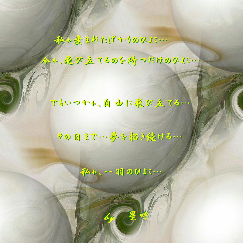 × [PR]上記の広告は3ヶ月以上新規記事投稿のないブログに表示されています。新しい記事を書く事で広告が消えます。 ――☆★☆―――――――――――――――☆★☆―― 蝶になるよ ――☆★☆―――――――――――――――☆★☆―― さみしいから あなたを思う。 もっとさみしくなるけれど、 あなたに舞う 蝶になれるよ 〇-----*****************************************-----〇 ★★★ 『 天国まで 』 by くぅ ♪♪♪ ★★★ 『優しくなりたい…行動したい…』 by 光呼 ♪♪♪ ★★★ 『 赤 』 by ふぅ ♪♪♪ 〇-----*****************************************-----〇 PR 何か埋まらない気持ち 何か穴の空いた気持ち 本当ゎ気付いてた だけど 分からない振りをしてきた 強がってみたり 籠のなかに閉じこもったり 自分を隠してきた だけど もぅ隠していきたくない もぅ気付いてしまったんだ 本当ゎ友達が欲しい 本当ゎ輪にはいりたい 今からでも間に合うかな 今からでもやり直せるかな 自分の気持ちに素直になる自分の気持ちを隠さない。 今からでも やり直していきたい もぅ一度 ひろいあつめながら 『 素直な気持ち 』 by 星呼![]() ★ 『 あるがまんまで、今日も生きていこうね 』風を体で感じてみる… 雨を体で感じてみる… 熱を体で感じてみる… だけど… 全部違うんだ… 感じたいものゎ… 風でも… 雨でも… 熱でもない… 私が感じたいのゎ… 人の暖かさ… 人の… 愛 なんだ… ずっと感じたかったのゎ 支えて支えられる 愛という絆で結ばれた 人の暖かさなんだ… 『 私が感じたいのゎ… 』 より転載。z ☆☆☆ 『 ふぅへ 』 by 星呼 ☆☆☆ 『 自分 』 by ふぅ ☆☆☆ 『 『今』とぃぅ時間を大切にしてほしぃ 』 by 美呼 ☆☆☆ 『 < 構わず、あなたでありなさい > 』 ☆☆☆ 『 階段 』 by 光呼 ねぇ、君は知っていたの? ねぇ、君は繋いでくれてたの? 「目を閉じてごらん」 そんな君は言う 綺麗な声で君はそう呟く 沈黙の世界に揺れる音 沈黙の世界に揺れる心 沈黙を嫌う僕に君はやさしく呟いた 「目を閉じてごらん」 そんな君の声に誘われて 僕はやさしく目を瞑る あんまりあたたかくて 目を閉じれば君が浮かんでくる あんまりあたたかくて 目を閉じれば涙が浮かんでくる 君と僕を繋いでる音は 流れるような音でもなくて 沈黙のなかに流れてる音 きっと、音のない音 ねぇ、とてもあたたかいの ねぇ、君がとてもあたたかいの 目を閉じてるとほんとに繋がるの 音のない世界が僕たちを繋ぐの ねぇ、そこには何が見えてるの? ねぇ、そこには何が聞こえてるの? ここには綺麗な月が見えてるよ ここには綺麗な君の声が聞こえてるよ だから、しあわせだよ 音と音が繋ぐ、音 無と無が繋ぐ、音 僕たちにしか見えないもの 僕たちにしか聞こえないもの ほら、その全部が宝物 ほら、その全部が愛の贈り物 その全部が きっと、あたたかい きっと、やさしい きっと、えいえん きっと、しあわせ 見つけてしまったよ君の見つけ方を 見つけてしまったよ君の温度の感じ方を 見えない君を見つけてしまったよ ほら、ここにも君はいる うん、君はあたたかいの うん、君はやさしいの いつだってやさしく笑うの いつだってやさしく泣いてるの きれいだな あったかいな なみだでちゃうな でも、わらっちゃうな ここをこんなにもあったかくしてしまうのは きっと、君のせいなんだからね だからね、もういなくならないでね このまま先に行ってしまわないでね 僕を置いてかないで あたたかくしたままひとりになんかしないで ここをあっためられるのは君だけなんだよ ここをつめたくするのも君だけなんだよ だから、見えなくても傍にいて ここは寂しいよ ここはいつだってひとりぼっちだよ だけど、ここもあったかいよ ここはいつだってひとりぼっちなんかじゃないよ ありがとう ありがとう 声も音もない世界に 君がいればただあたたかい ありがとう ありがとう 声も音もない世界に 君の声を届けてくれてありがとう ずっと、探し回って ずっと、這いつくばって この場所を傷つけて踏みつけても 捨ててしまったもの全部 それでもやさしく光るから ここは僕だけの世界じゃないよ ここは君だけの世界じゃないよ だから、あたたかいんだよ 素敵に笑う君に、ありがとう 素敵に泣く君が、大好きだよ ★★★ 『 ふたりいろ 』 by 光呼 ♪♪♪ ★★★ 『 私たちはみんな等しく星の子なんです 』 ♪♪♪ 『 それだけで君を君にしてやれるさ 』 by 光呼 それを壊せたら大したもんだろ でもそれを守りきれたら? もっと大したもんだろ あぁやってできたものは なかなか壊れてくれなくて うん、それに守れやしないんだ わがままさ いつだってどこでだって きっと僕はわがままさ 勝手さお子様さ でもそれでもいいのさ そうだな それも何かと素敵さ 笑って泣いて ありがとうとごめんねが言えたら それだけできっと素敵さ 僕じゃない僕が泣いてと叫ぶから それなら泣いてみても いいんじゃないかなって思って わんわんわめいてやったんだ だけどさ 僕じゃない僕が泣
